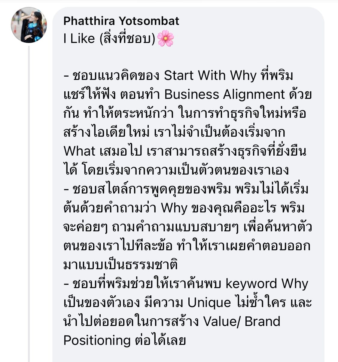 - ค้นหา 'Why' ของคุณ นั่นคือ Purpose หรือจุดประสงค์เบื้องลึกในการทำอาชีพของคุณ ทำให้คุณเข้าใจตัวเอง และสร้างงาน ตลอดจนธุรกิจให้ตอบจุดประสงค์นี้